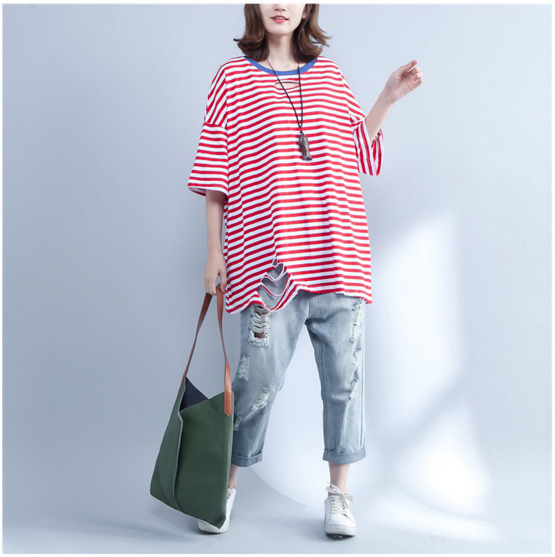 大图 : 大码条纹T恤女2018夏季新品韩版休闲宽松胖MM短袖中长上衣